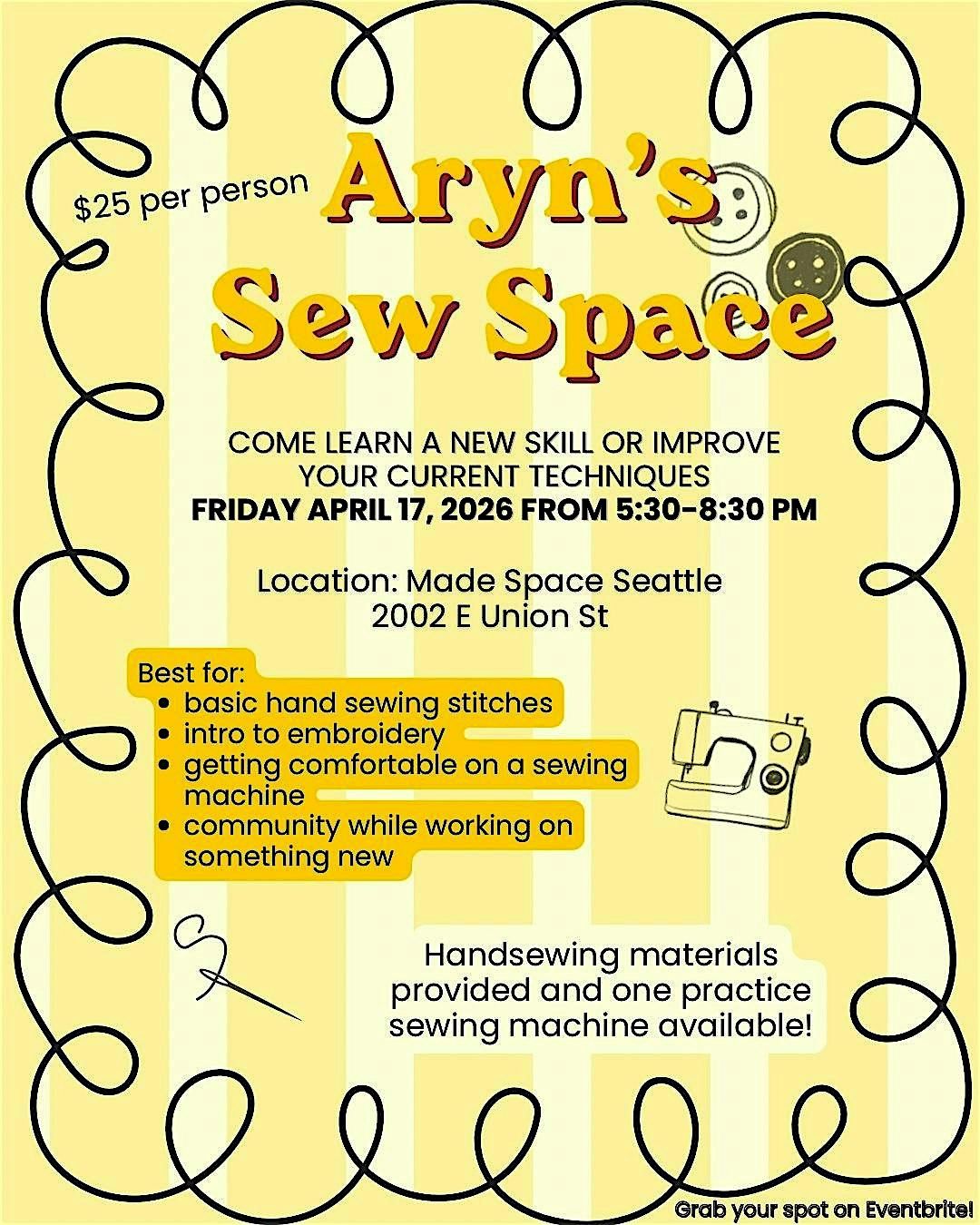 Come hang out at Made Space Seattle on April 17, 2026 at 5:30 PM (PDT) for a fun, hands-on sewing session. Whether you’re a pro or just curious, it’s a chill spot to get creative and meet fellow sewing lovers. Bring your ideas, your projects, or just yourself – we’ll provide instruction if you need, some basic materials for hand sewing/embroidery, and a sewing machine to practice getting comfortable on.