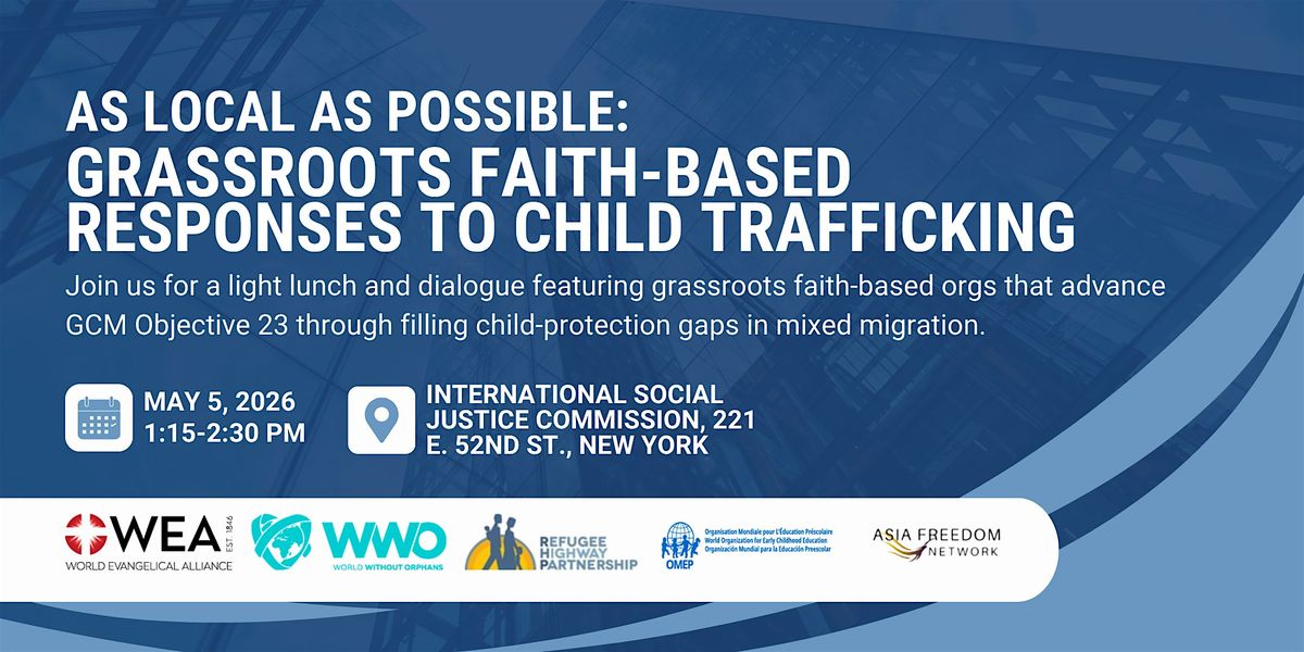 Please join us for a light lunch as we explore As Local As Possible: Grassroots Faith‑based Responses to Child Trafficking in Migration. This event brings together UN Member States, UN agencies, civil society, and faith‑based organizations to address critical protection gaps for migrant, refugee, asylum‑seeking, and stateless children—especially where trafficking is misidentified as smuggling, leading to detention and deportation instead of safety.