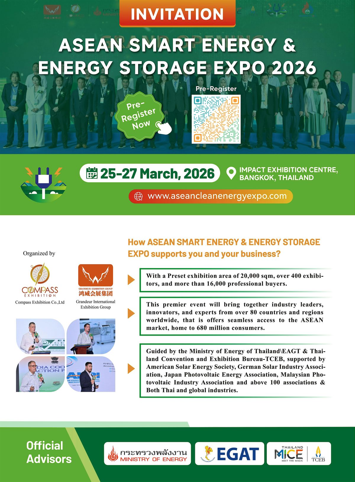Guided by the Ministry of Energy of Thailand & Electricity Generating Authority of Thailand-EAGT & Thailand Convention and Exhibition Bureau-TCEB, We are thrilled to announce that ASEAN Smart Energy & Energy Storage Expo 2026 is making a grand return from March 25-27 at the IMPACT Exhibition Centre, Bangkok, Thailand.