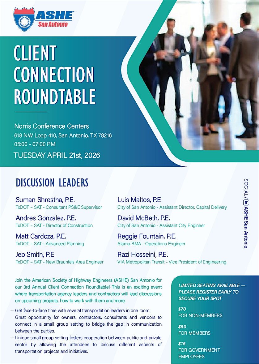 The American Society of Highway Engineers (ASHE) San Antonio Section invites you to join us for our 3rd Annual Client Connection Roundtable – an engaging event designed to foster meaningful dialogue between transportation agency leaders and industry professionals. This unique opportunity allows owners, consultants, and contractors to connect directly with public agency representatives in an interactive small group setting.