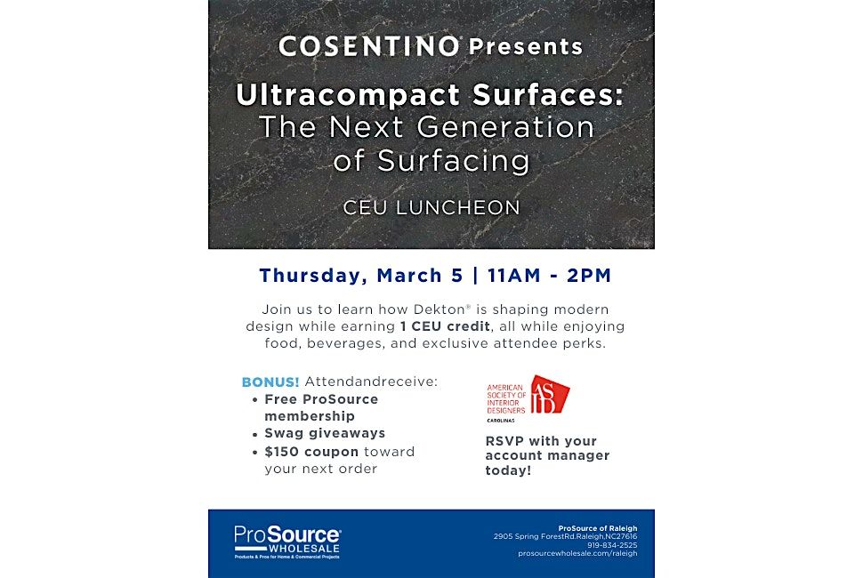 Join ASID Carolinas Triangle Design Community for a CEU Lunch & Learn of Cosentino Ultra Compact Surfaces with a bonus for attendees: Free ProSource membership - Swag giveaways - $150 coupon