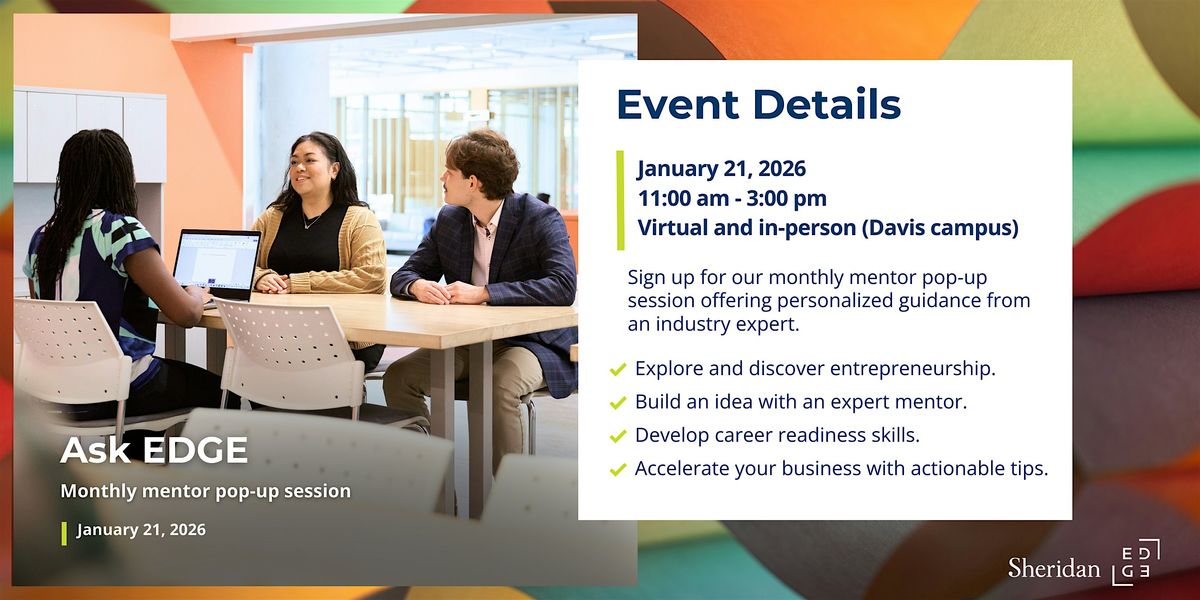 Our mentor will help you level up in whatever stage you’re at — from exploring entrepreneurship to refining your business model or scaling your venture. You’ll get personalized guidance tailored to your specific level of support, including learning and development, career readiness, idea development, business planning, and growth strategies.This is your space to ask questions, get guidance, and start building something that matters to you. No experience needed — just bring your questions and walk away with clarity. All Sheridan students are welcome.