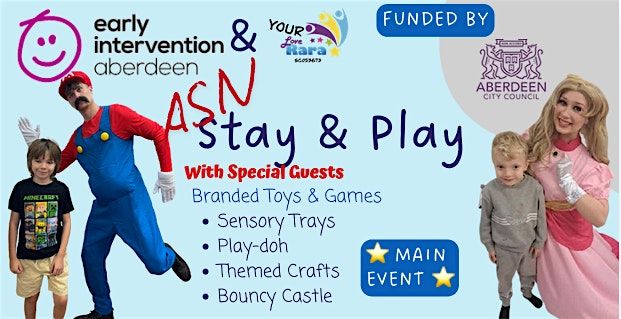 Funded by Aberdeen City Council for children with additional support needs and their siblings - Stay and Play with Bouncy Castle, Super Mario bros Toys and Games, and photo opportunities with guest actors taking the role of Mario an Princess Peach