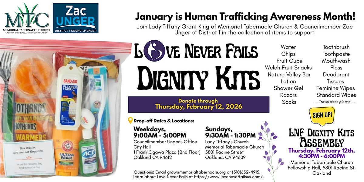 Lady Tiffany Grant King and Councilmember Zac Unger invite you to get engaged through Thursday, February 12, 2026 by donating items (travel size) to help assemble 1,000 Dignity Kits to support survivors of trafficking and sexual assault.