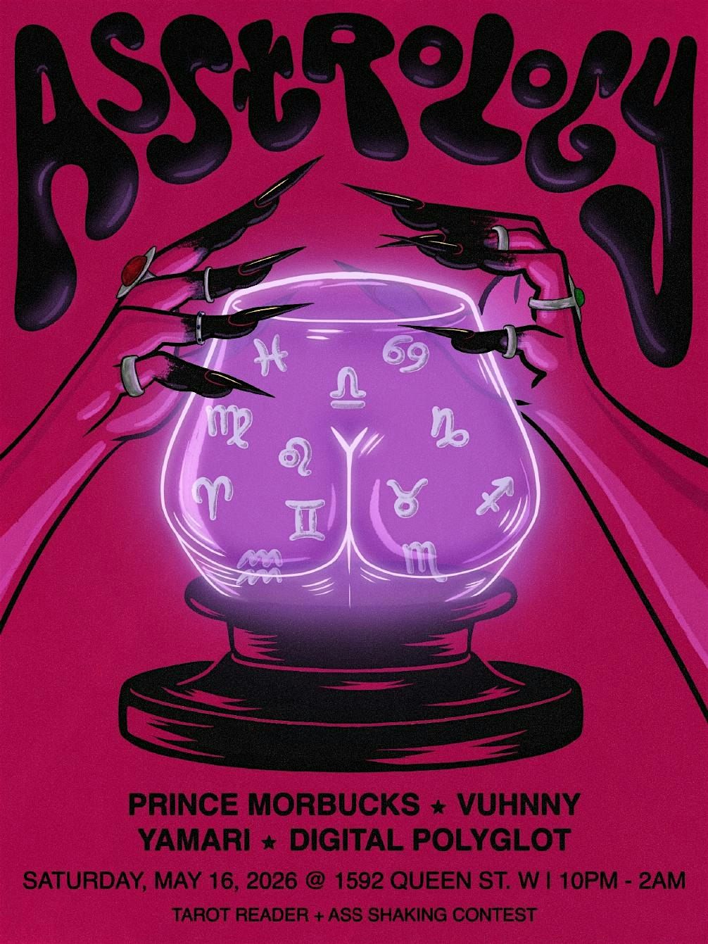 ATTENTION ASS-TROLOGY SIGN HOLDERS!!! DJ representatives of the earth (digital polyglot), water (VUHNNY), fire (yamari), and air (Prince Morbucks) signs will be spinning electronic bass, afrohouse, jersey, gqom, baile funk, reggaeton, house, global bass/club to help you throw your ass throughout the night. Celebrate your sun / moon / rising by dressing up as your signs. (Think mysterious-ness of a scorpio, aesthetically pleasing like a libra, or you like the finer things in life like a taurus.)