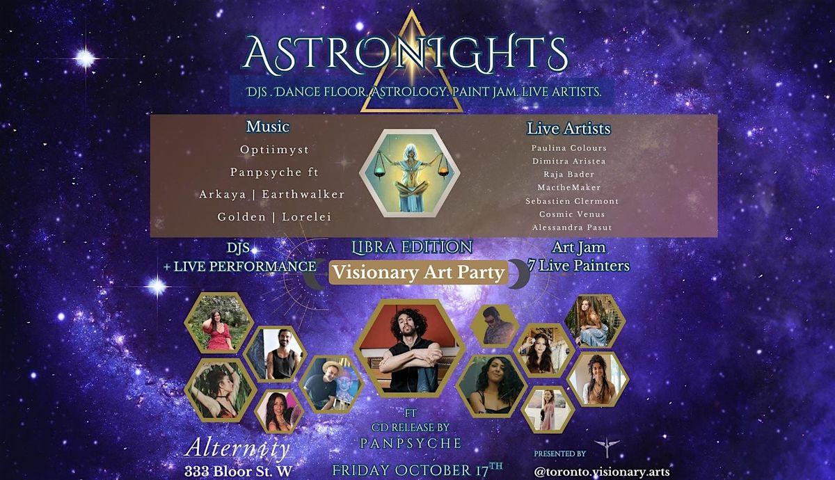 Express yourself and network with fellow artists while immersed by the sounds of local DJs. Toronto Visionary Arts will supply some basic art materials for those who wish to do art, alongside our featured live painters. We will be giving a special shoutout for the Libras, and mark their bday month with an opening Astrology Talk💫