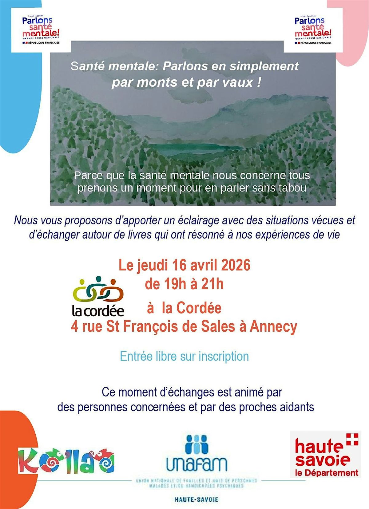 À l’heure où la santé mentale est reconnue comme un enjeu de santé publique majeur, l'UNAFAM 74 & le dispositif Kollao organisent une soirée intitulée "Santé mentale : Parlons-en simplement, par monts et par vaux !".