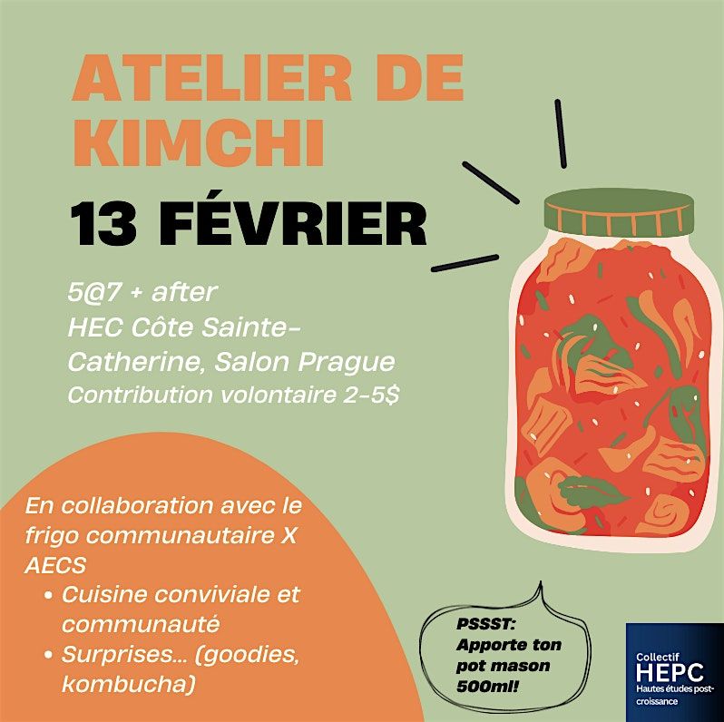 En collaboration avec le Frigo communautaire, le Collectif HEPC vous a préparé un atelier Kimchi! Venez apprendre à faire votre propre Kimchi de manière conviviale et avec votre communauté! Voici les informations importantes: