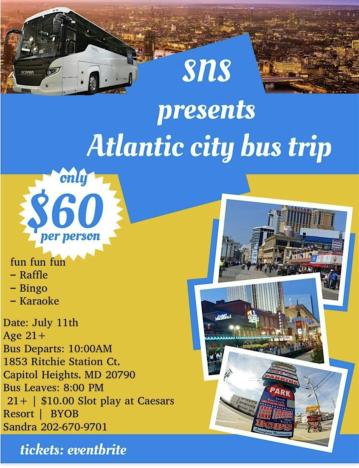Get ready to party in style at the Atlantic City Party Bus event! Hop on board our luxurious party bus and ride in comfort to the one and only Caesars Atlantic City. Whether you're celebrating a special occasion or just looking for a fun night out, this event is perfect for you. Enjoy music and good vibes as we cruise down the iconic Atlantic City strip. Don't miss out on this unforgettable experience!