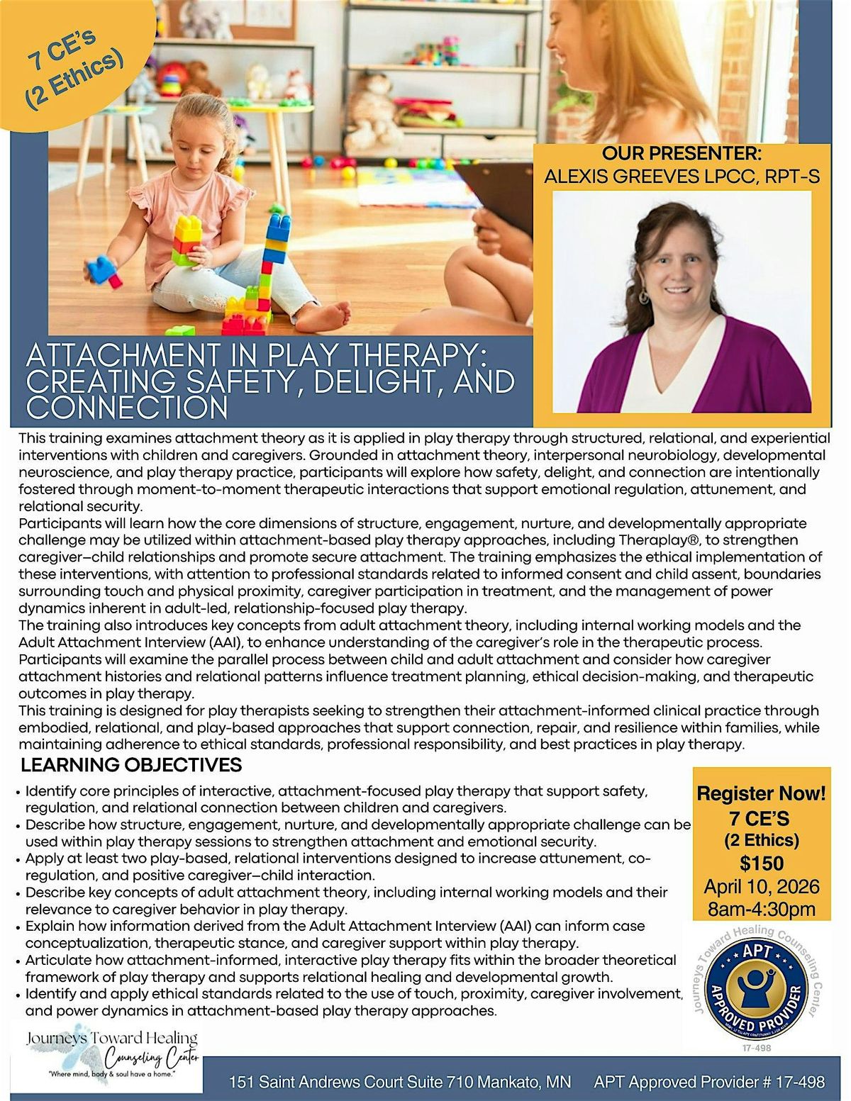 EARN 7 play therapy CE's and 2 Ethics CE's. This training examines attachment theory as it is applied in play therapy through structured...About this Event
