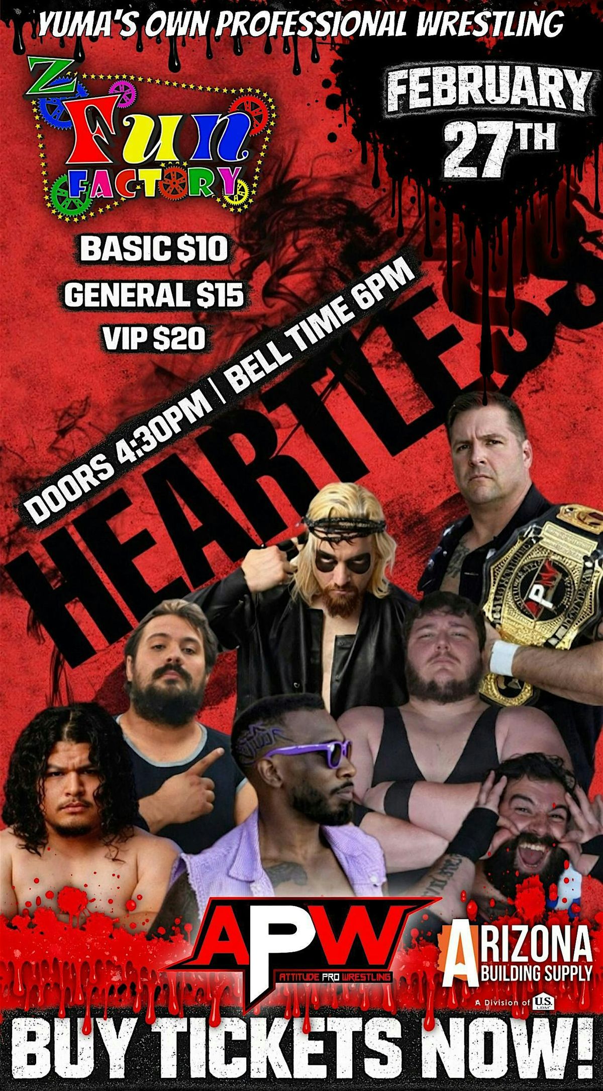 Get ready for an unforgettable night of hard-hitting action as Attitude Pro Wrestling : HEARTLESS! (APW) returns to Z Fun Factory on February 27th! After an explosive last event, the stakes are higher, the rivalries are hotter, and the action will be more intense than ever.