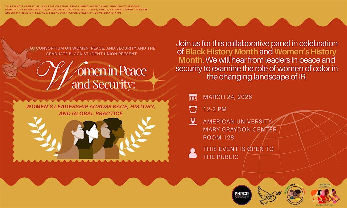 Join the AU Consortium on Women, Peace, and Security and the Au Graduate Black Student Union for this collaborative panel in celebration of Black History Month and Women’s History Month! We will hear from four leaders in peace and security to examine the role of women of color in the changing landscape of IR. This event is open to all; AU affiliation is not necessary to attend.