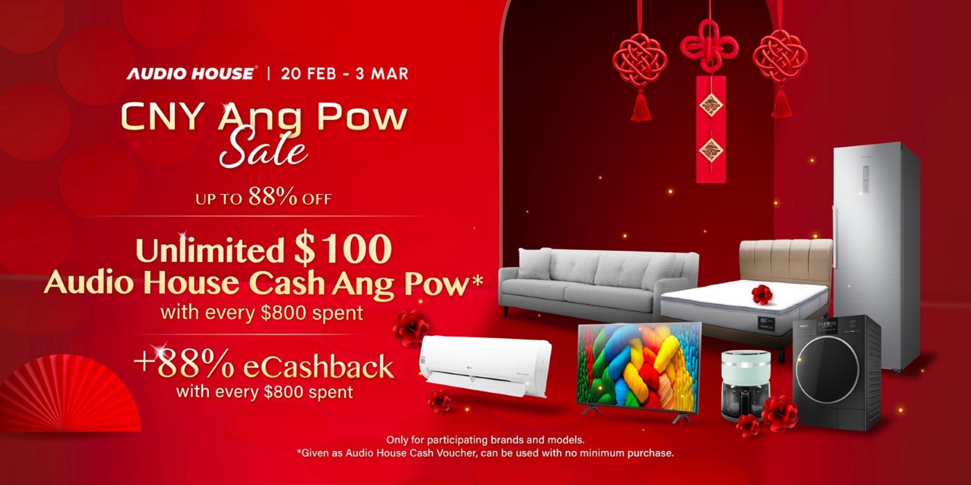 From 20 February to 3 March 2026, Audio House will be running its CNY Ang Pow Sale, featuring savings of up to 88% off participating home appliances and bedding brands including AcerPure, Ariston, Beko, Cuckoo, EuropAce, Four Star, Hisense, JBL, Kadeka, KDK, King Koil, LG, Mayer, Midea, Mitsubishi Electric, NNIO, Panasonic, Philips, Ruhens, Samsung, Sharp, Toshiba, Turbo and more.