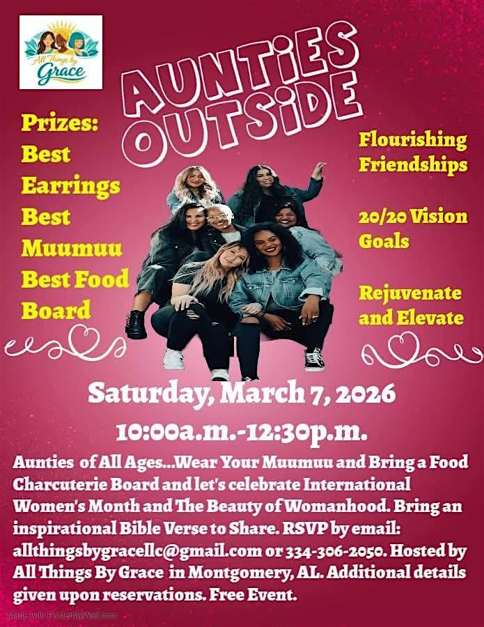 A Celebration for The Beauty in Womanhood: International Women's Day Celebration. Come for flourishing friendships, 20/20 Vision Goals, Rejuvenation and Elevation. The Theme is "God is My Source and Resource." Bring a food charcuterie board. Great music, great people, a health tip, and most importantly inspiration from the Word. Bring an inspirational Bible Verse to share with the Aunties. There are a couple of Prizes to win: Best Earrings, Best Muumuu Attire, and Best Food Board theme. Plus get your shopping on with the Pop-Up Vendors and buy you something nice.