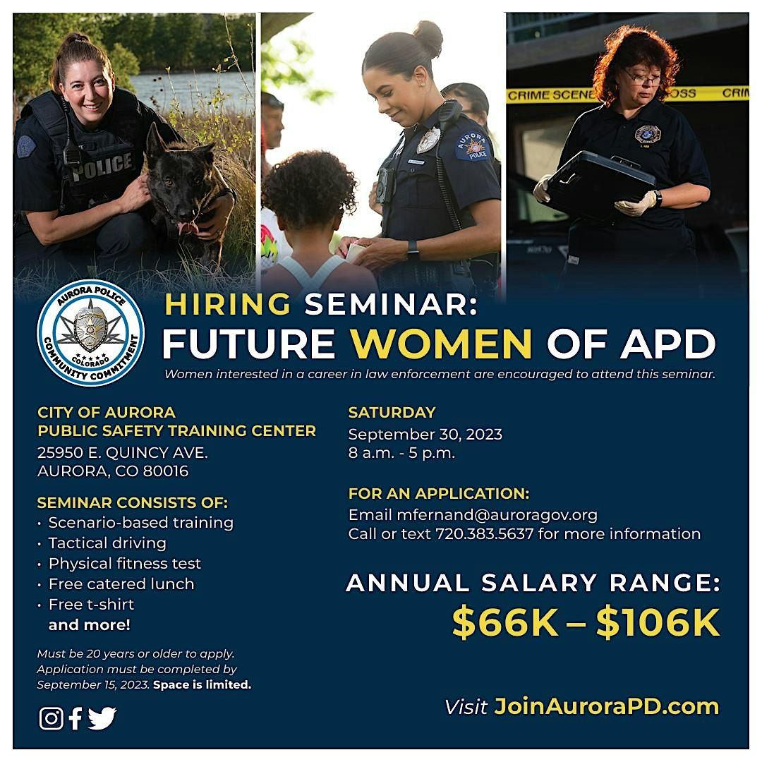 Do you want information on how to become an Aurora Police Officer? Join the Aurora Police Department’s Recruiting Unit for an informational and physical fitness seminar. Bring your family, friends, or anyone who has questions regarding becoming an Aurora Police Officer. This is a casual event, registration is recommended. Please wear your PT clothes when arrive. Water and snacks will be provided. Please arrive before 10 A.M. Questions? Please email Officer Nguyen [email protected]