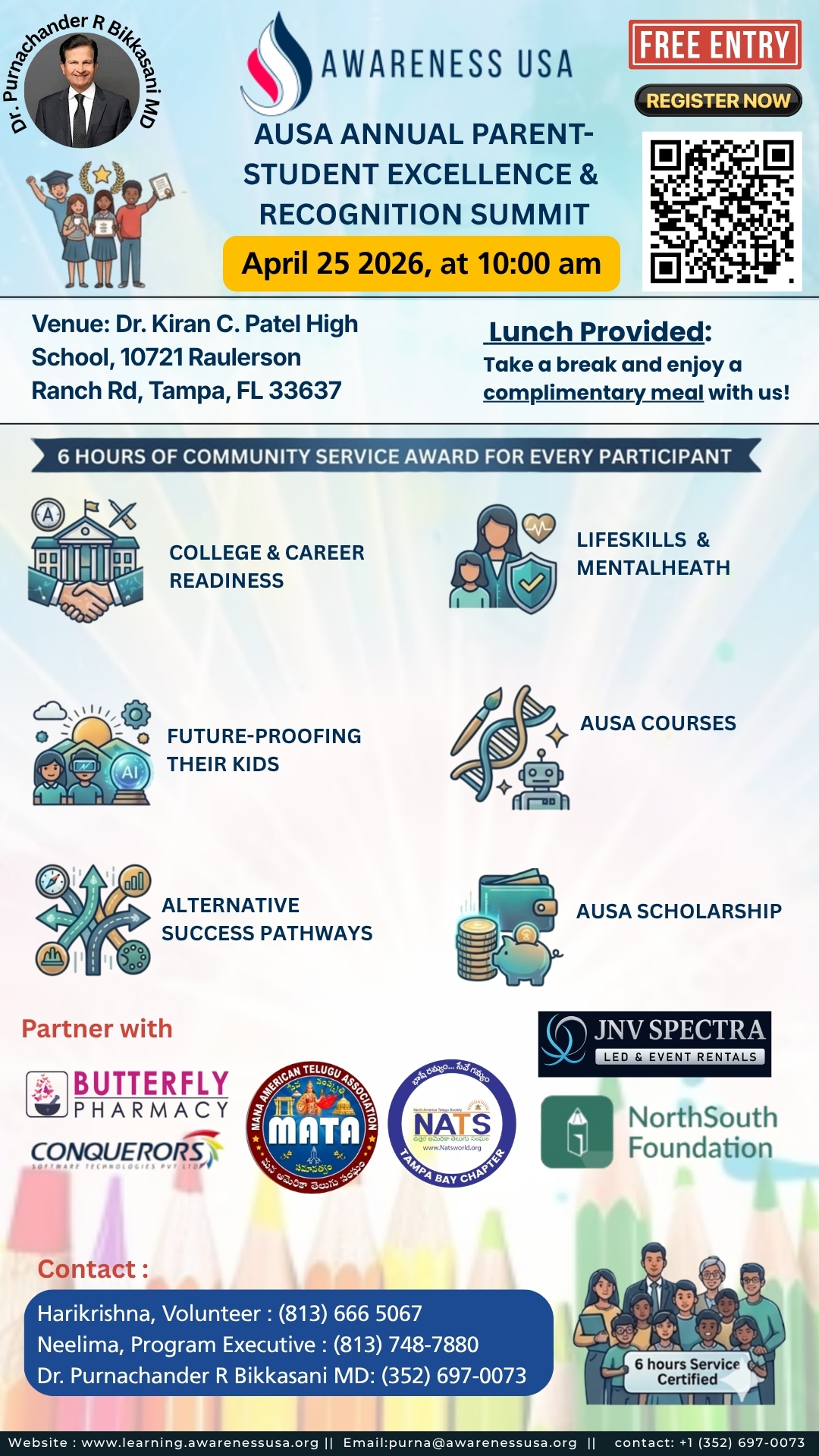 Welcome to the much-anticipated AUSA Annual Parent-Student Excellence & Recognition Summit, hosted by Mana American Telugu Association on April 25, 2026, at the prestigious Dr. Kiran C. Patel High School in Tampa.