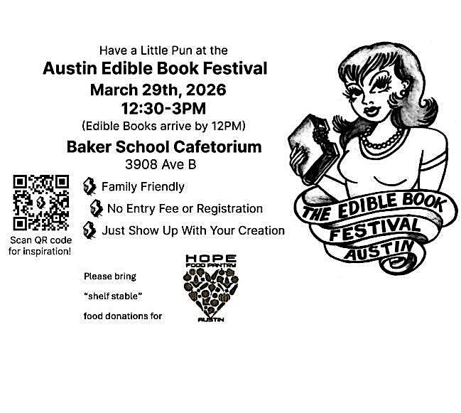 (Austin, TX) The Austin Edible Book Festival returns for literary and culinary hijinks on Sunday, March 29, 2026, from 12:30 – 3:00 PM at the Baker Center. This tradition showcases serious fun, as local bibliophiles – that is - ANYONE and EVERYONE is invited to create edible books to share and to compete for prizes and hilarity. Please bring Edible Creations at Noon. Visitors will vote in categories ranging from “most book-like” to “least appetizing.”