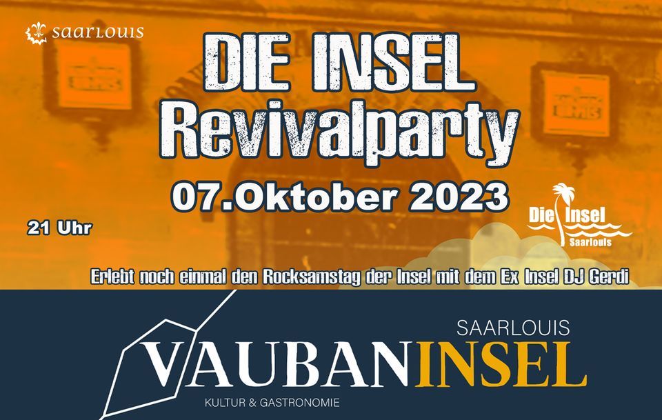 DIE INSEL Revival PartyZurück in die gute alte Zeit, sich wieder wie 18 fühlen und an einem legendären Ort eine legendäre Nacht verbringen. Die Insel auf der Saarlouiser Vauban Insel war für viele Jahre die Institution im Saarlouiser Nachtleben. Viele haben hier ihre Wochenenden verbracht und die Nacht zum Tag gemacht.