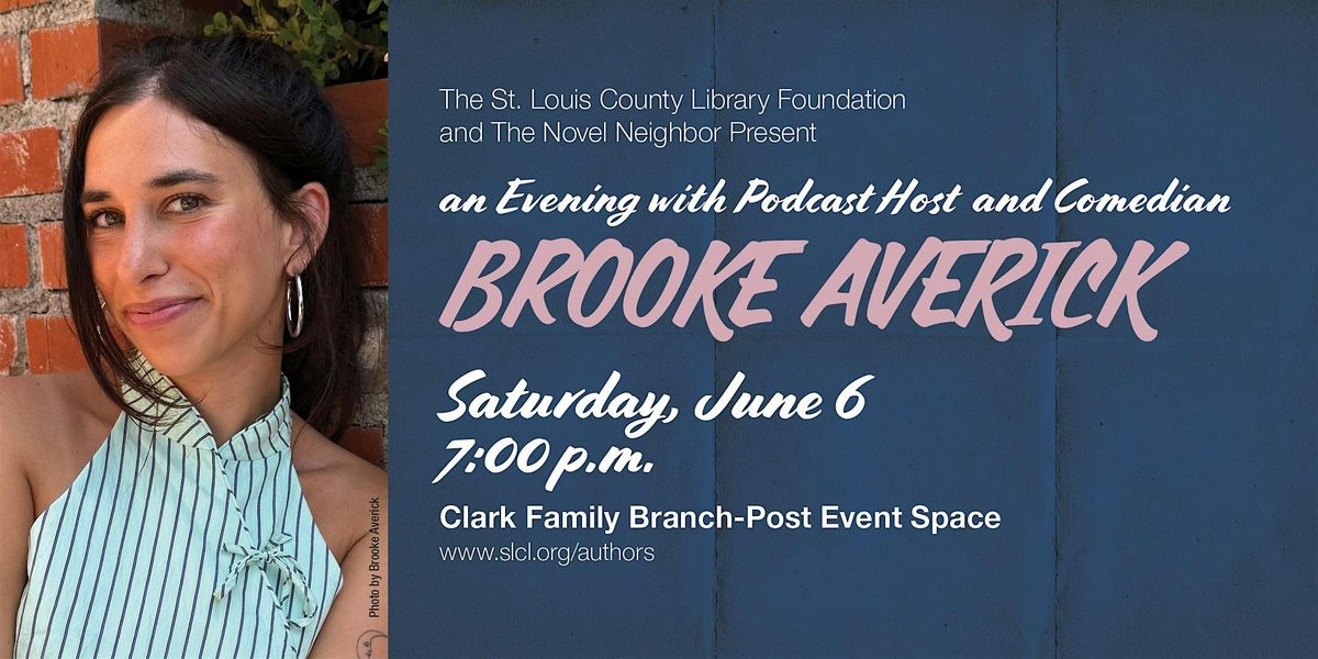 Top image description: Photo of Brooke Averick. Text: St. Louis County Library Foundation and The Novel Neighbor present an Evening with Podcast Host and Comedian Brook Averick. Saturday, June 6, 7:00 p.m. Clark Family Branch - Post Event Space. www.slcl.org/authors.