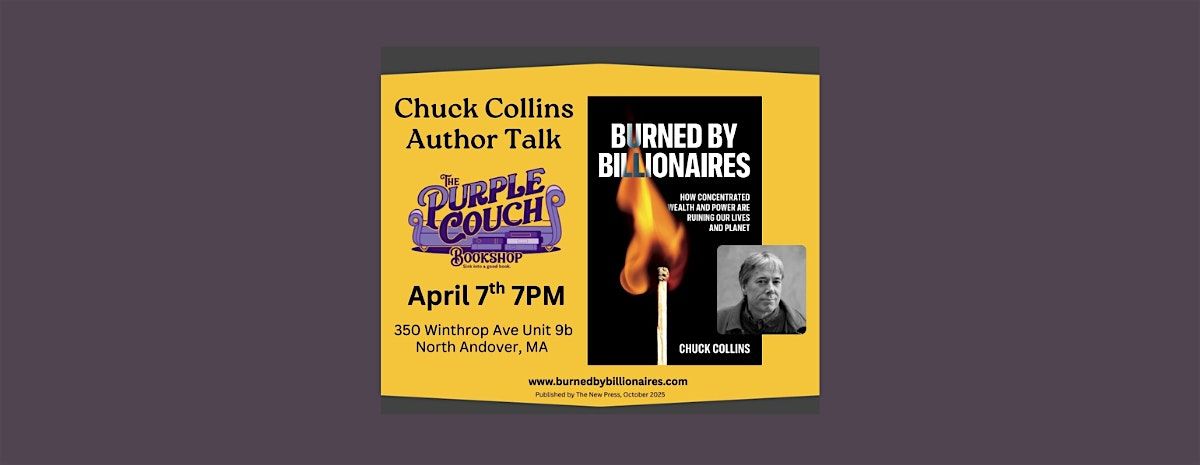 Join the Purple Couch Bookshop as we welcome Author Chuck Collins for a discussion and signing of his book, Burned By Billionaires. We ask that you register so we prepare for adequate seating. Registered attendees will receive 10% off the book. Admission is free, but you can also preorder your book by purchasing a "paid" ticket.