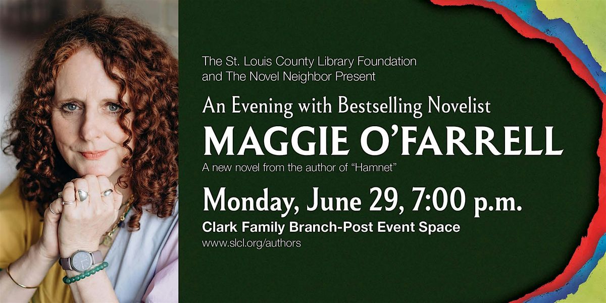 Top image description: Photo of Maggie O'Farrell. Text: St. Louis County Library Foundation and The Novel Neighbor present an Evening with Bestselling Novelist Maggie O'Farrell. A new novel from the author of "Hamnet." Monday, June 29, 7:00 p.m. Clark Family Branch - Post Event Space. www.slcl.org/authors.