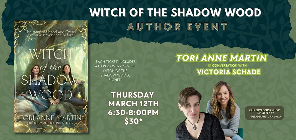 Join us at Cupid’s Bookshop for a special evening celebrating the release of Witch of the Shadow Wood, the brand-new feminist cozy romantasy retelling of the classic fairy tale Hansel and Gretel, complete with a sapphic love story and a revenge tale, from USA Today bestselling author Tori Anne Martin.