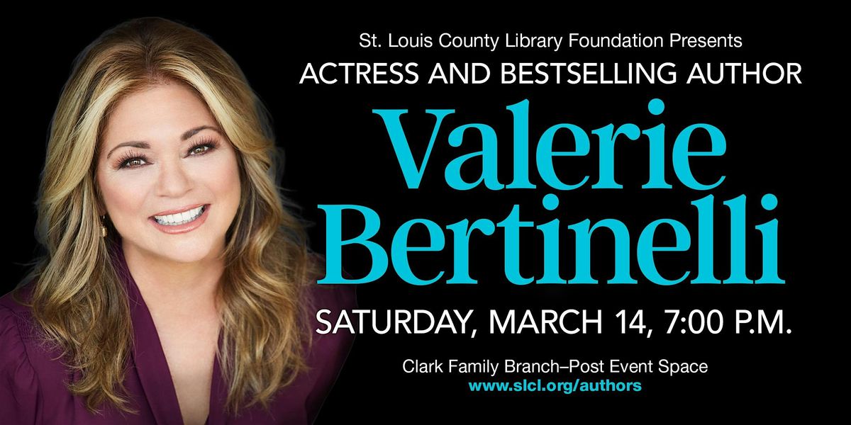 Top image description: Photo of Valerie Bertinelli. Text: St. Louis County Library Foundation and Left Bank Books present Actress and Bestselling Author Valerie Bertinelli. Saturday, March 15, 7:00 p.m. Clark Family Branch - Post Event Space. www.slcl.org/authors.