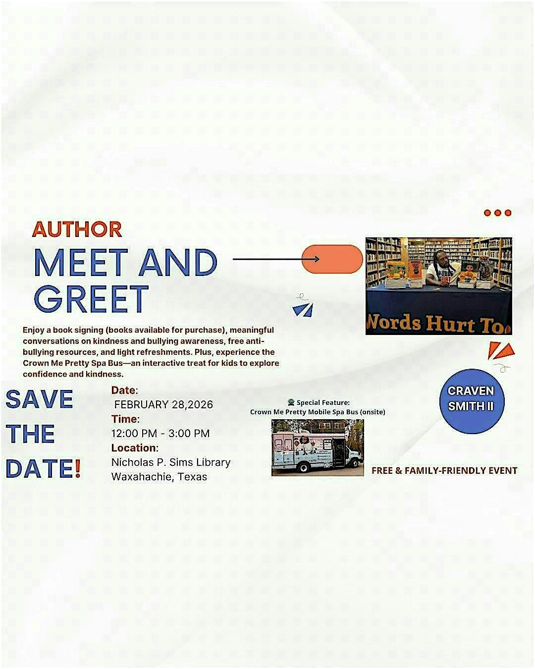 Meet author Craven Smith II for an uplifting, family-friendly event focused on kindness, confidence, and anti-bullying.