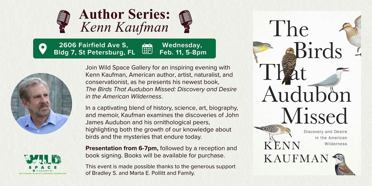 Join Wild Space Gallery for an inspiring evening with Kenn Kaufman, American author, artist, naturalist, and conservationist, as he presents his newest book, The Birds That Audubon Missed: Discovery and Desire in the American Wilderness. Kaufman examines the scientific discoveries of John James Audubon and his ornithological peers in a captivating blend of history, science, art, biography, and memoir—praised by Kirkus Reviews as “a bird lovers’ delight.” Kaufman created portraits of birds Audubon never saw, painted in his own style showing how our understanding of birds continues to gain clarity while some mysteries endure from Audubon’s time to ours.