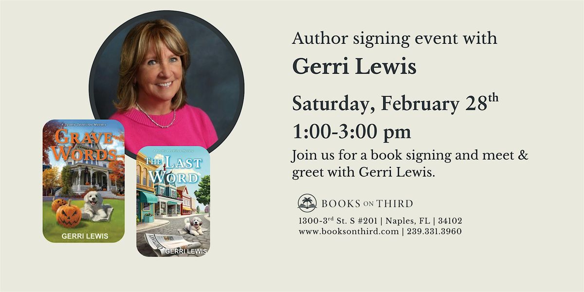Join us at Books on Third for an in-store author signing with Gerri Lewis, author of The Last Word and Grave Words, the first two books in her charming Deadly Deadlines Mystery series.