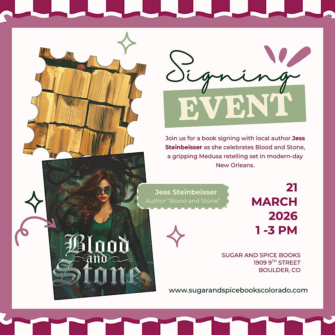 Join us Saturday, March 21, 1–3 PM at Sugar & Spice Books for a special book signing with local author Jess Steinbeisser. She’ll be signing copies of her thrilling Medusa retelling, Blood and Stone. Stop by to meet Jess, grab a signed book, and chat about myth, mystery, and revenge. Free to attend!