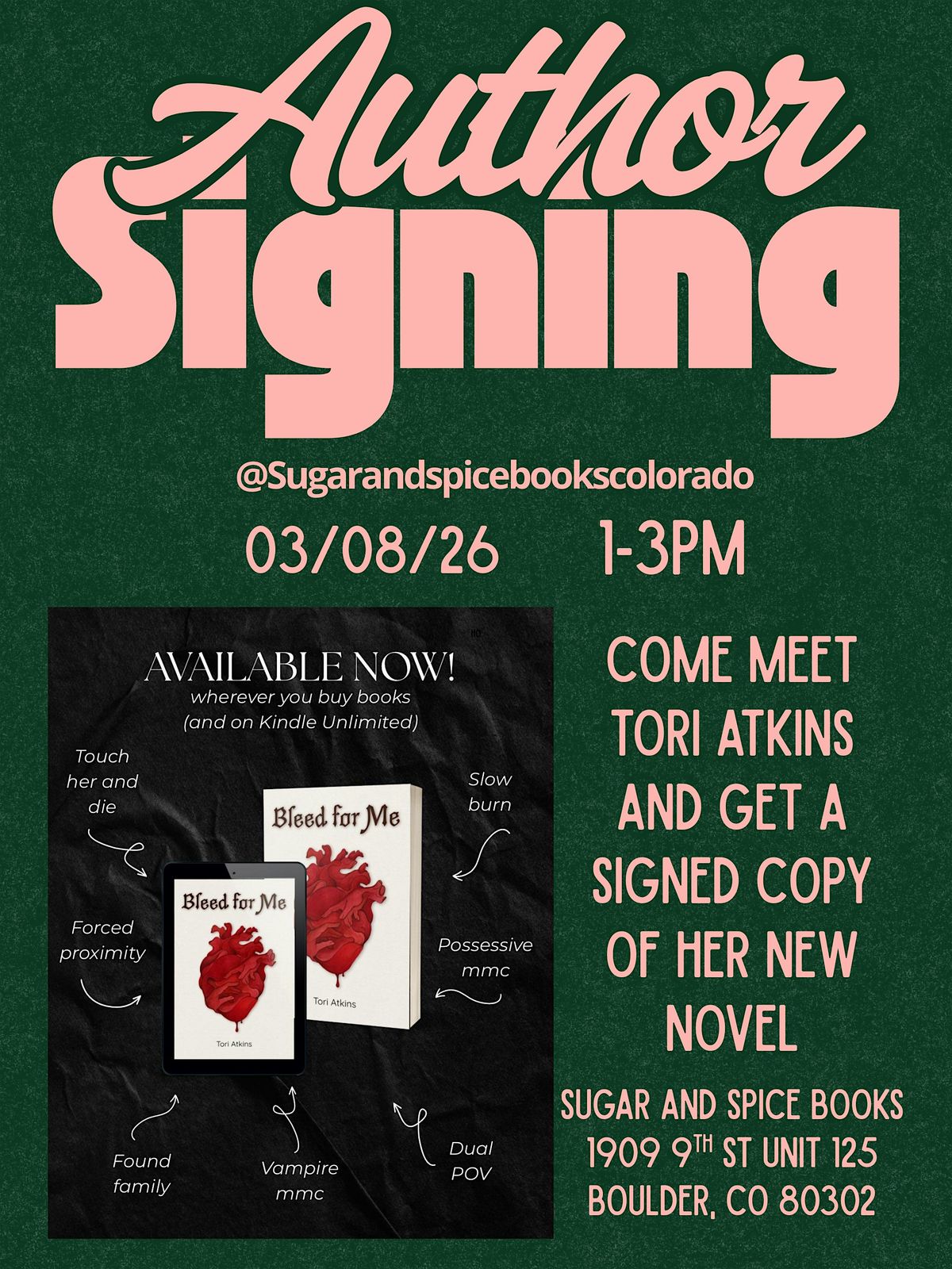 Come celebrate the release of Tori's second novel, Bleed For Me, and get a signed copy to take home with you!