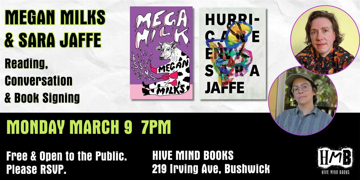 Join us at Hive Mind Books in Bushwick for a queer literary double header! One night only: the incomparable, the stupendous, the not-to-be-missed Megan Milks and Sara Jaffe are teaming up to present their brand new books, Mega Milk: Essays and Hurricane Envy.