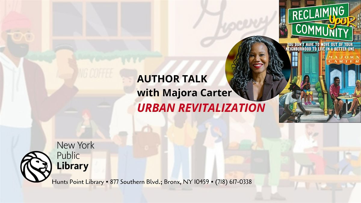 Join native South Bronx resident, Majora Carter, a urban revitalization strategist and author of Reclaiming your community: You don't have to move out of your neighborhood to live in a better one ... for a powerful discussion on the rethinking of poverty, inequality, economic development, and individual/family success in our community.