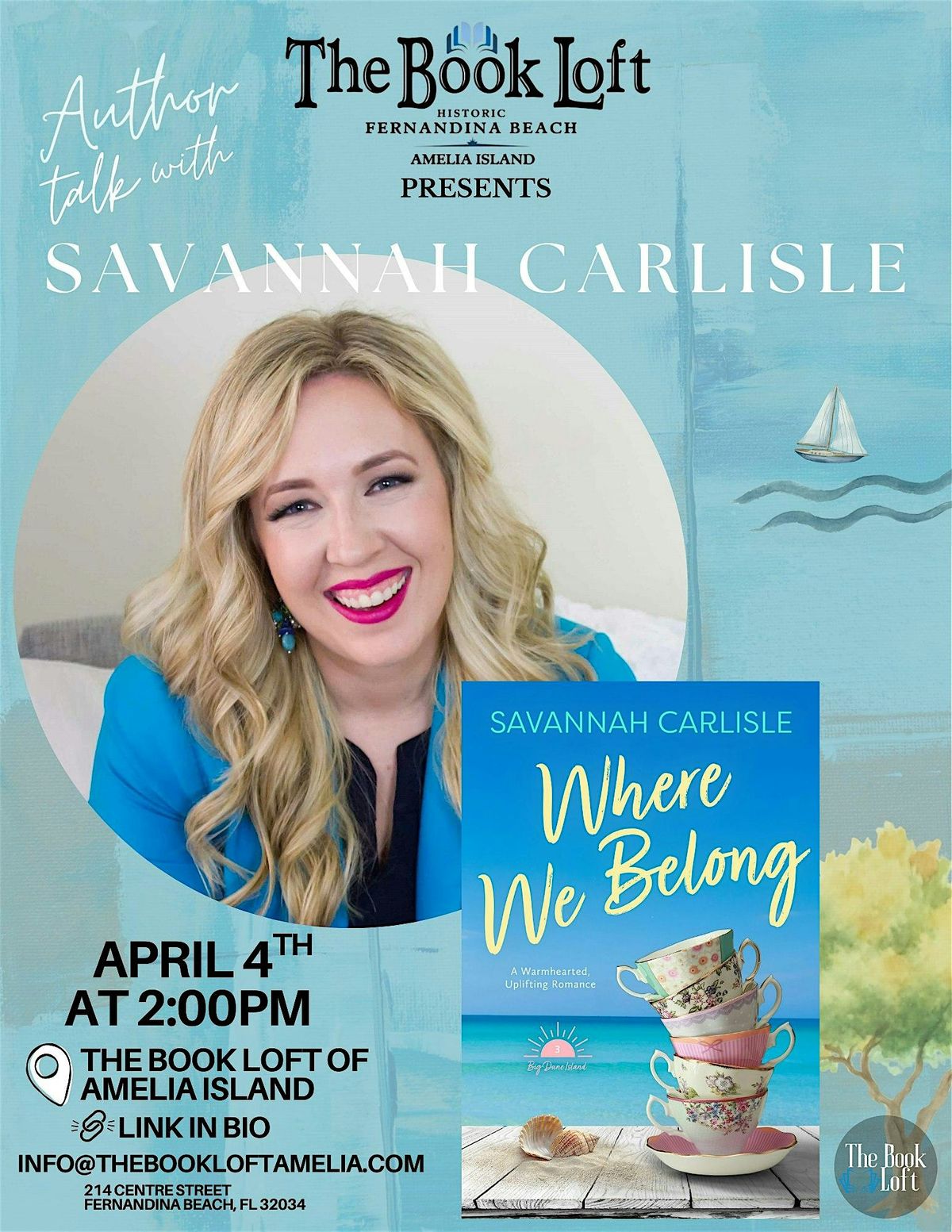 Join us at 2PM upstairs on Saturday, April 4th at The Book Loft for a FREE Author Talk with local romance author, Savannah Carlisle as she discusses her newest release. Where We Belong is the 3rd book in her Big Dune Island series. She will be signing books at the end of the event.