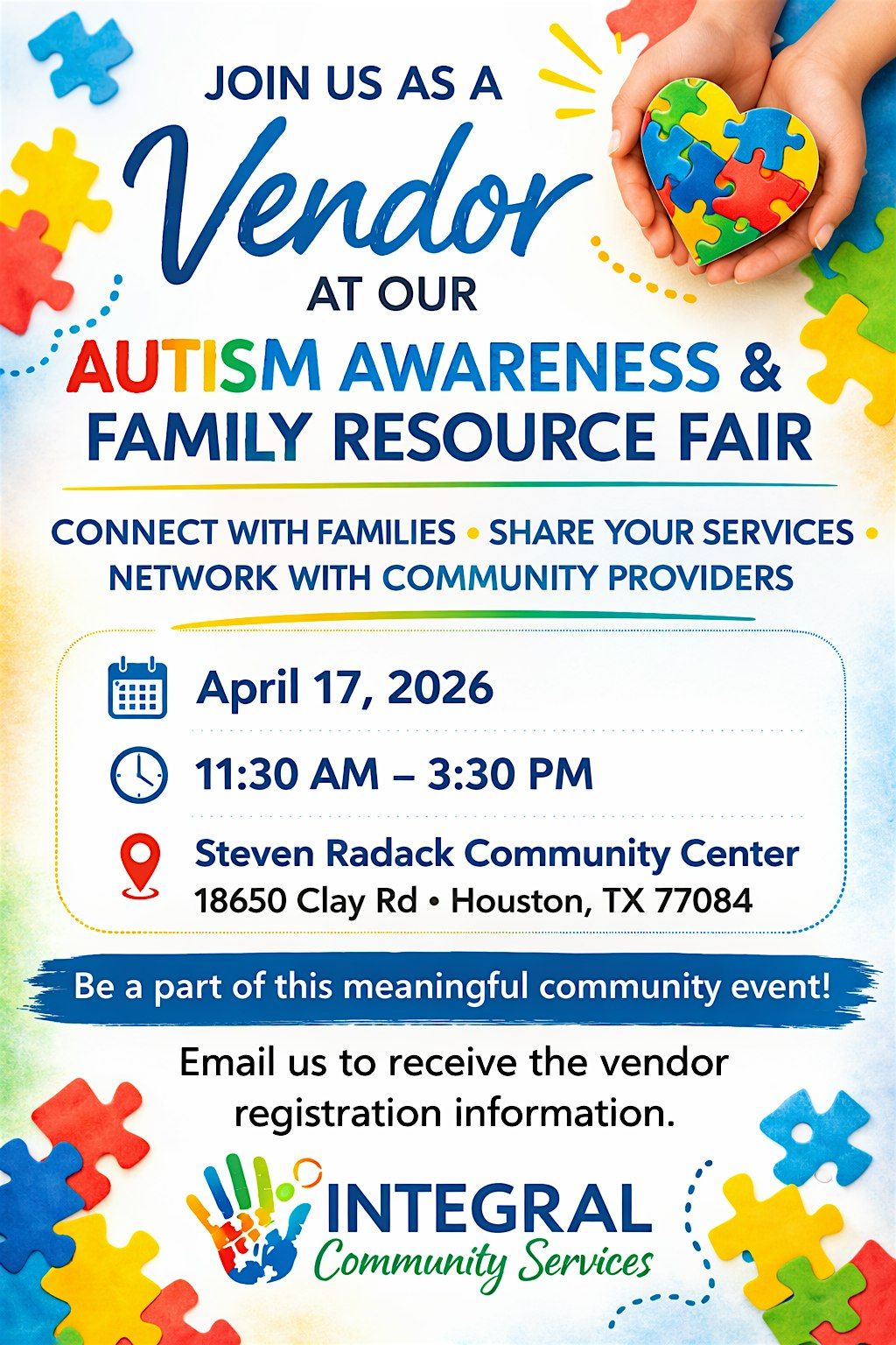 Integral Community Services invites community organizations and service providers to register as vendors for our Autism Awareness & Family Resource Fair. This event brings together families, caregivers, and providers to share valuable resources, services, and support for children on the autism spectrum.