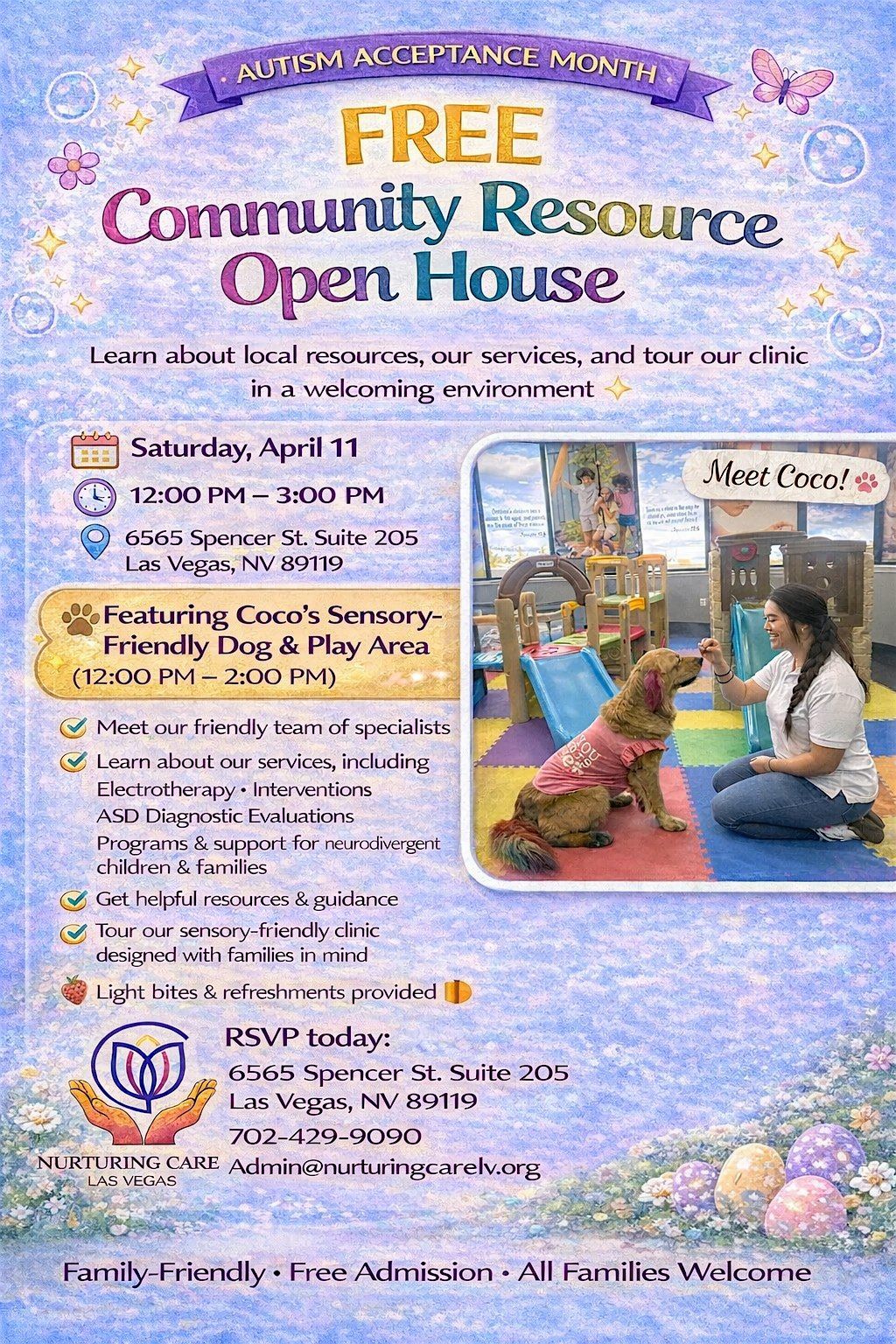 Join us for our Autism Community Resource Open House at Nurturing Care Las Vegas! This event is designed to support children on the spectrum and their families by providing access to valuable resources, connection, and a welcoming environment.