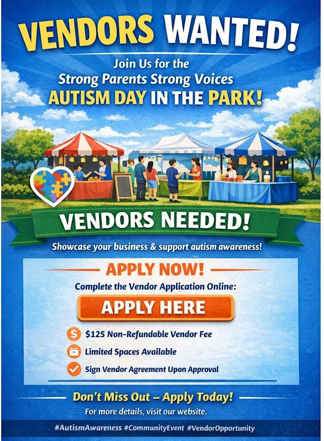 We are currently accepting vendors for the Strong Parents Strong Voices Autism Awareness Day in the Park event! This is a great opportunity to showcase your business, connect with families, and support autism awareness in our community. 💙