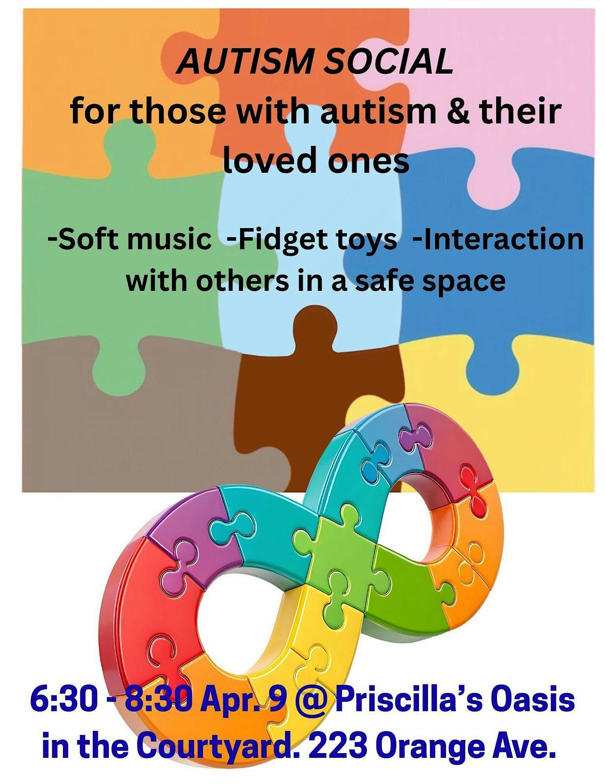 Open Air Courtyard at a cozy alcohol-free lounge and mocktail bar is the venue for this unique special gathering, designed to allow people with autism and those who care for them to enjoy time out of the house, in a safe social setting, and interact with others who understand. Beverages and snacks available for purchase. You may pay at the event or purchase the $5 ticket here on eventbrite (the platform adds a small fee). No outside beverages allowed but food can be brought in. We'll have soft calming music playing, fidget toys, board games and sketch pads for all to use if they wish. We look forward to seeing you along with members of the Treasure Coast Autism group on FB where we have created the event as well. Questions? Contact Harmony Music Events (on Google), your organizer. Free parking in garage just 50 yards west of the venue. PRISCILLA'S OASIS ON ORANGE in the Historic waterfront district, downtown Fort Pierce.