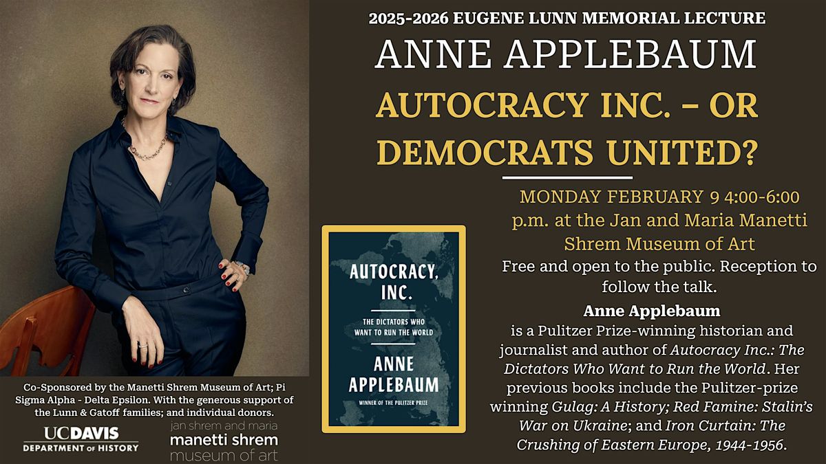 Applebaum's talk, "Autocracy, Inc. -- or Democrats United?” is based on her most recent book, the best-selling Autocracy, Inc. (2025). Reception to follow talk. Event is free and open to the public.