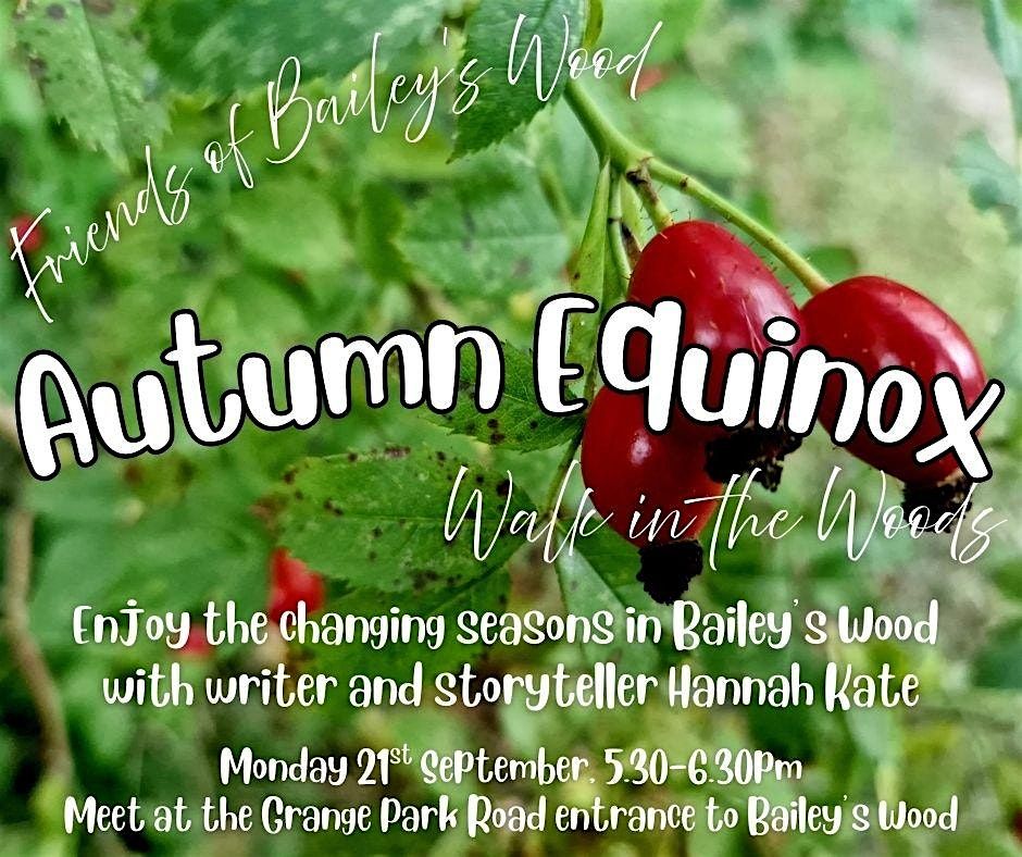 Join us in the woods to mark the Autumn Equinox and enjoy the changing seasons. This is a gentle walk, suitable for most abilities and ages, with seasonal conversation and stories led by writer Hannah Kate. Meet at the Grange Park Road entrance to the woods.