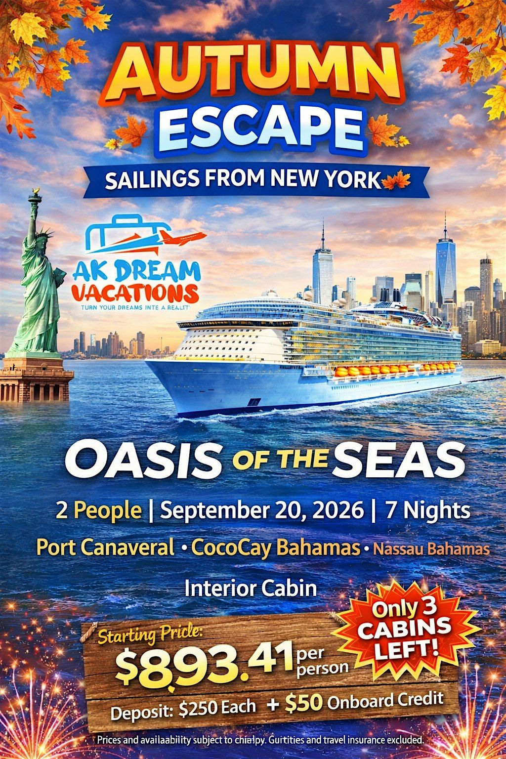 Get ready to dive into the ultimate fall adventure right in the heart of New York! Join us for an exciting in-person cruise that captures the magic of autumn. Enjoy crisp air, stunning skyline views, and the perfect escape from the usual hustle. Whether you're with friends or flying solo, this cruise promises good vibes and unforgettable moments. Don’t miss out on experiencing New York’s autumn charm from the water!