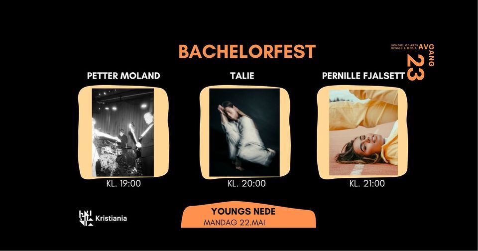 Vi inviterer til Bachelorfest på Youngs Nede!Som avslutning etter tre år på Bachelor i populærmusikk ved Kristiania spiller syv avgangsstudenter sine bachelorkonserter 22. og 23. mai!