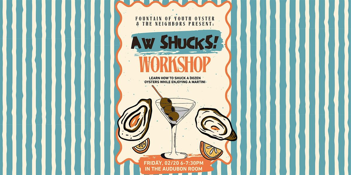 Join us for a shuckin' workshop inside our private event space, The Audubon Room. The night will include a welcome martini followed by an introduction to oysters from Oyster John of Fountain of Youth Oysters. Next, John will walk the class of 10 through the proper technique of oyster shucking. Once you've mastered the craft, slurp down your dozen with our perfectly paired NBRS Dirty Martini. Additional food & drinks will be available for purchase.
