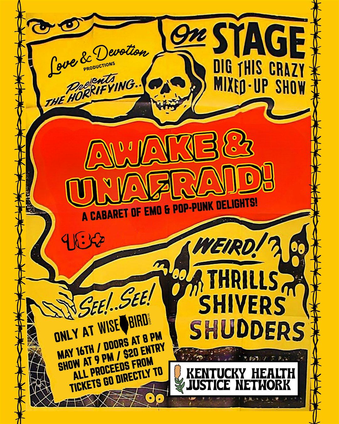 High theatrics, bold looks, and an ode to the genres that made us who we are today -- Awake & Unafraid! A Cabaret of Emo & Pop-Punk Delights. Proceeds from every ticket sold will go directly back to KHJN during their Fund-A-Thon, providing access to reproductive care needs for Kentuckians during a time when it's needed most. We highly suggest dressing on theme and joining in the fun of reliving the glory days -- MySpace, Warped Tour, OG Hot Topic (iykyk!)...you'll be in good company 😉