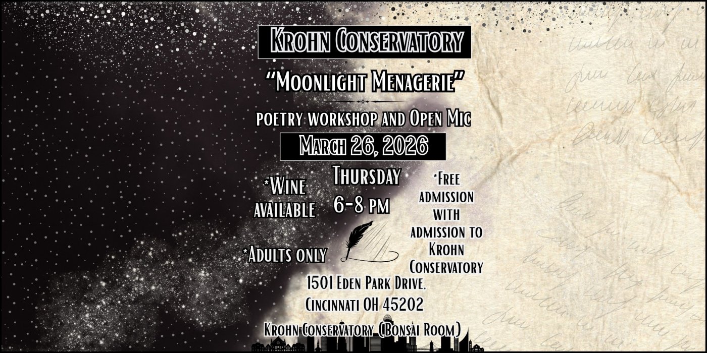 1501 Eden Park Drive, Cincinnati, OH 45202 Writing Workshop and Open Mic in the Bonsai room is free for those over 21 years old with $10 general admission to Krohn botanical gardens.