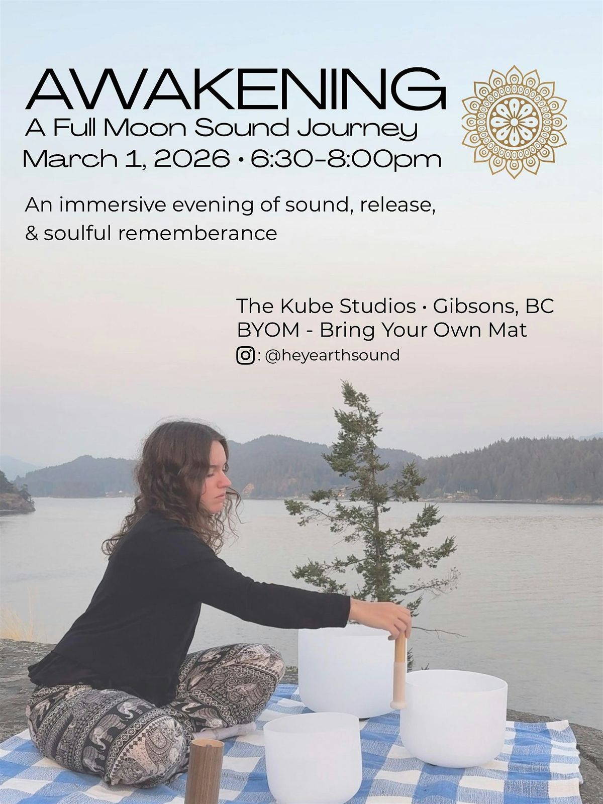 Under the full moon, AWAKENING is a 1.5-hour sound journey at KUBE Studios with crystal bowls, tongue drum, koshi chimes, seed shaker, voice