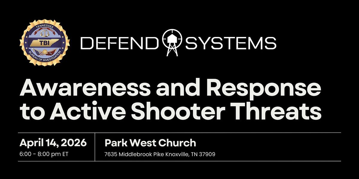 Come join Defend Systems and TBI at Park West Church in Knoxville for an evening of learning how to respond to active shooter situations. This free in-person event is a unique and valuable opportunity to enhance your knowledge and abilities in handling emergency situations. This dynamic presentation takes a comprehensive look at the frequent problem of active violence and actions that increase survivability.
