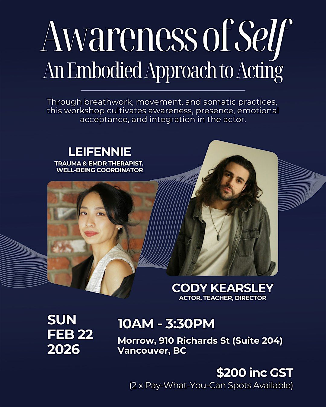 This workshop explores acting through a somatic approach, centering the body as a living, responsive instrument rather than something to be pushed, overridden, or controlled. Many actors are trained to work through discomfort or disconnection, which over time can narrow creative range and weaken trust in one’s inner experience. Through a combination of somatic practices and acting exercises, participants will explore how reconnecting with the body can support greater presence, emotional access, and relational depth.The workshop is held within a supportive group environment where actors are invited to safely explore their relationship with emotions, vulnerability, and connection. Rather than focusing on performance outcomes, this space prioritizes presence, attunement, and care. The intention is to create conditions for corrective experiences in which participants can be seen, heard, and supported in ways that are often unavailable in traditional training or professional settings.