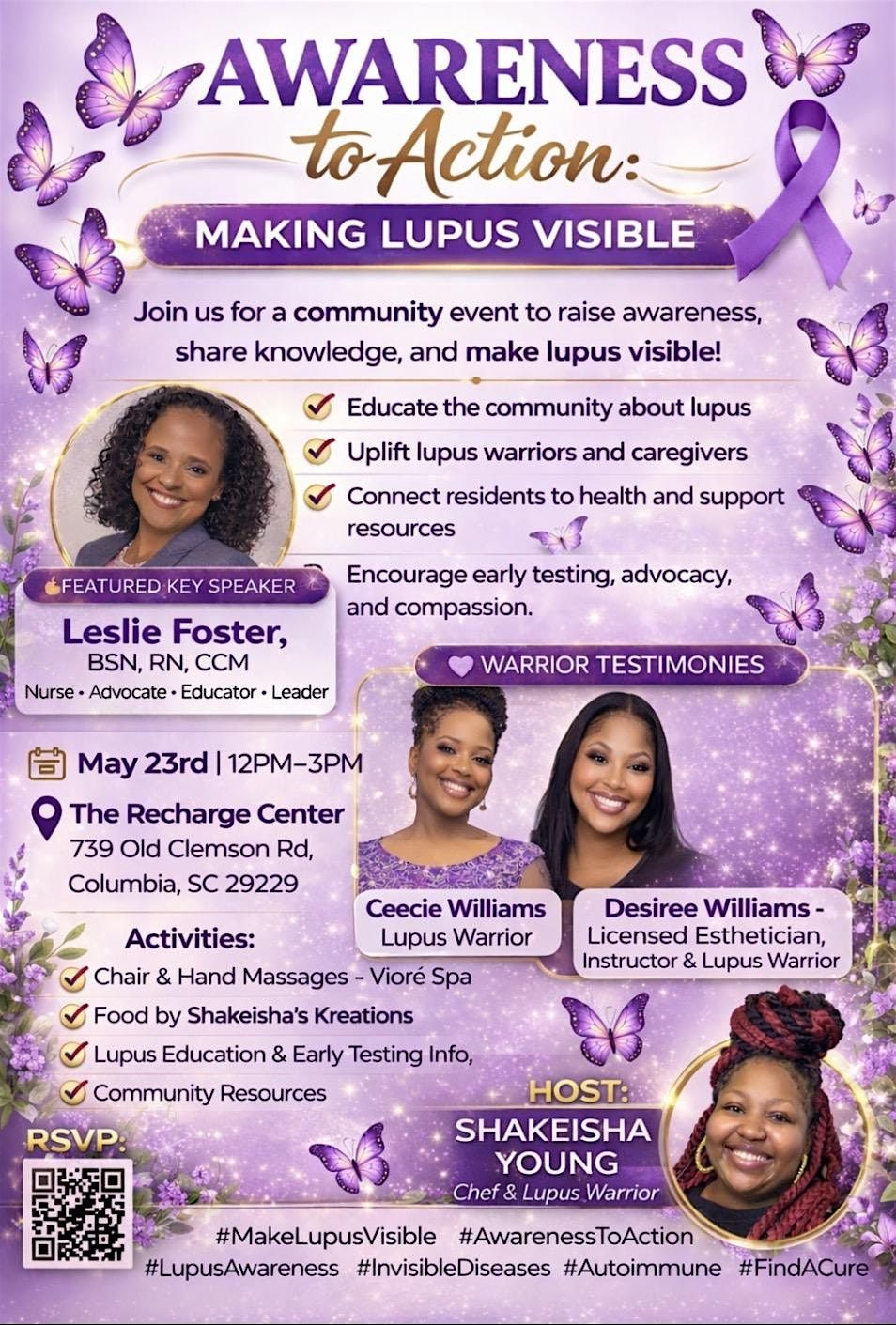 From Awareness to Action: Making Lupus Visible is a community event dedicated to educating the public about lupus, uplifting lupus warriors, and connecting residents to health and support resources. Through expert speakers, personal testimonies, interactive activities, and community reflection, this event aims to turn awareness into real community action and advocacy.
